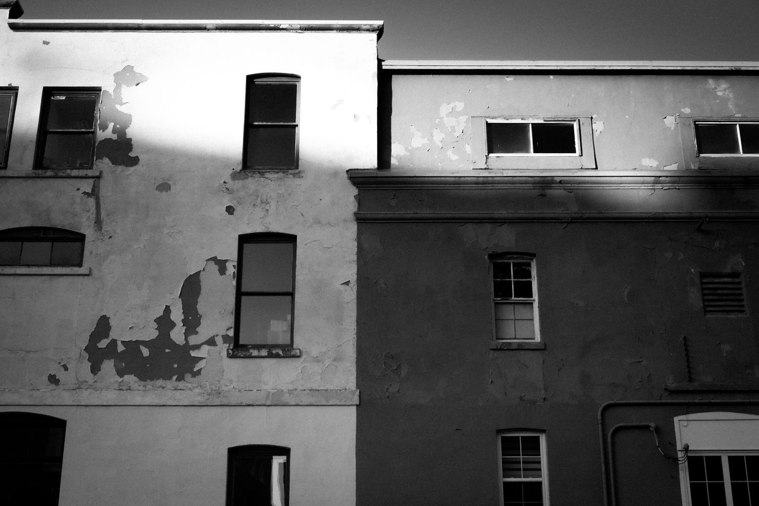 The last rays of sun on a couple of downtown buildings before it sets behind the hill.